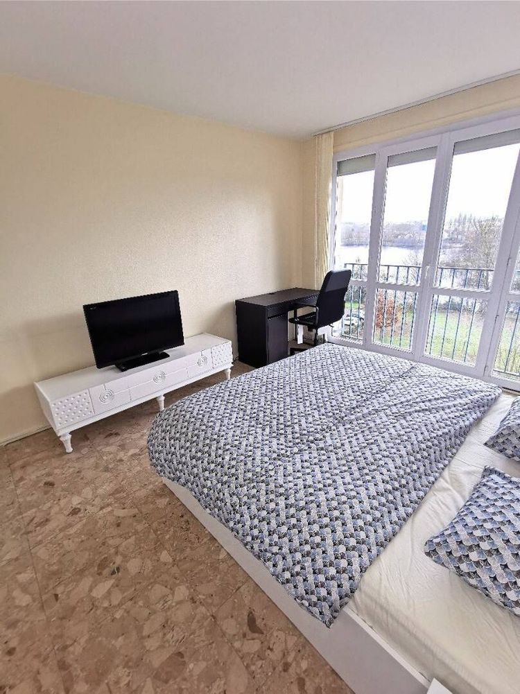 Chambre de 15 m² avec grande fenêtre et vue sur la Seine . Volet électrique. Comprenant un grand lit 2 places de 180*200 avec matelas confortable, un bureau avec sa chaise, une TV avec TNT, un placard. Une housse de couette et un drap housse fournis.