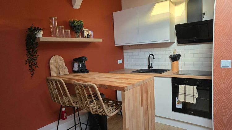 Superbe studio rénové il y a peu : salon/chambres, cuisine équipée, salle de bain.