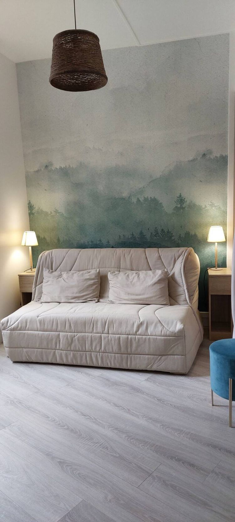 - pièce à vivre avec canapé-lit BZ confortable, commode, table et chaises pliables, dressing, TV