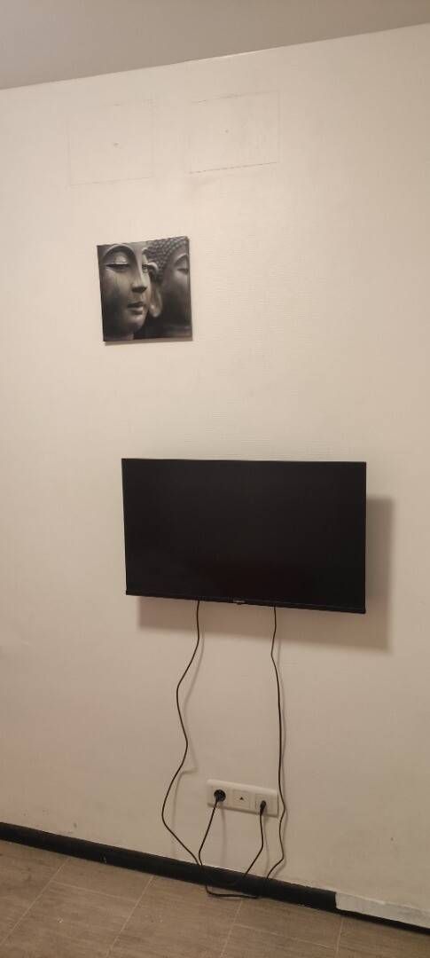 Belle chambre équipé d'un lit clicclac, d'une télé, d'une armoire et d'une table avec chaise pour pouvoir étudier ou travailler.