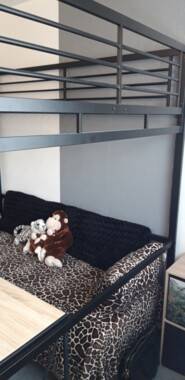 Lit double type mezzanine, vous aurez au dessous une jolie banquette pour faire un petit salon ou lit 1 personne et un vidéoprojecteur pour vos soirée cinéma. Une chaise et un bureau escamotable est à disposition. 1 placard 5 étages avec une penderie et des casiers sont également fournis. Tout le confort pour se reposer et étudier correctement.