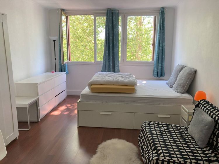 Grande chambre meublée 18 m² dans colocation 42 Avenue Vladimir Ilitch Lénine 92 000 NANTERRE à 800 mètres du RER Nanterre Ville en plein centre-ville commerçant. Elle comprend: - Un lit king size 160x200 cm - Un grand dressing, un miroir, une commode - Une chauffeuse convertible et ses tables basses gigognes - Une table à rabats, deux chaises, table de chevet