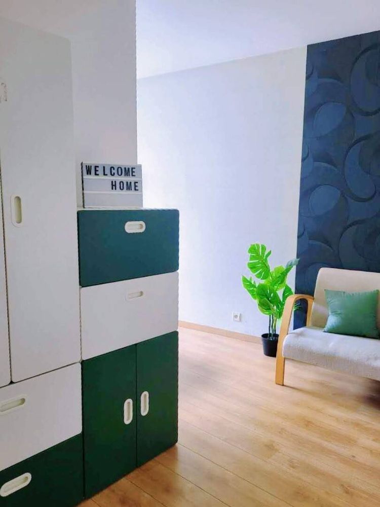 Equipée d'un armoire, un lit 140*190, un bureau + lampe + chaise, un chevet Equipped with a wardrobe, a 140*190 bed, a desk + lamp + chair, and a bedside table.