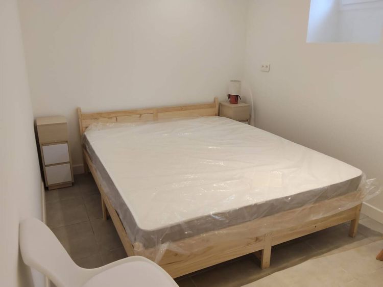 Chambre de 9m² équipée d'un lit 160*200, d'une commode, d'une table de chevet et d'un petit porte manteaux.