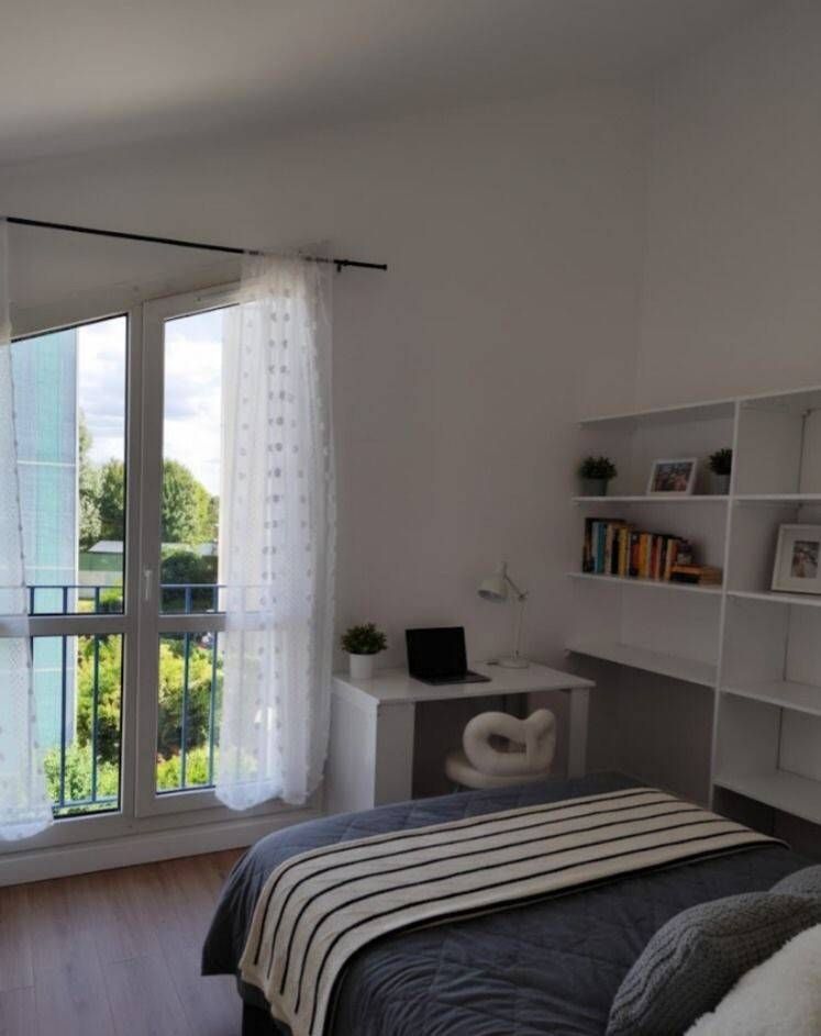 Équipements : lit double (140 cm) , bureau, chaise, armoire/rangement