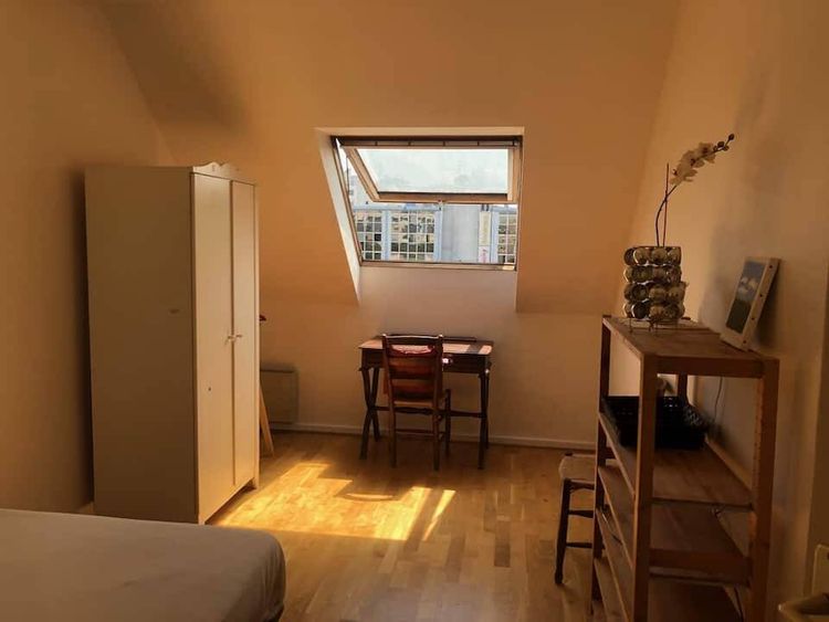 The bedroom is very big, very luminous, with a window door. It was the salon, before. The sofa bed is of very good quality, with a very good mattress