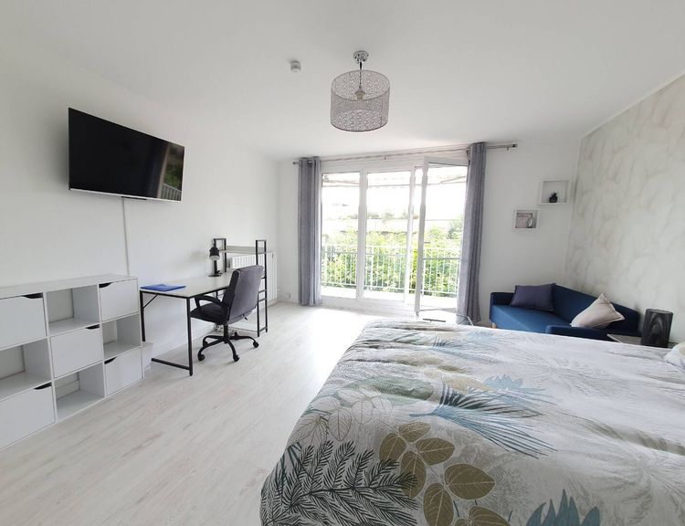 Grande chambre de 20 m² avec accès au balcon. Équipement de la chambre : un lit double 140×200 avec un matelas de qualité (linge de lit fourni), table de chevet avec lampe, dressing, panier à linge, bureau avec une chaise et une lampe, un canapé et table basse, une télévision. Chaque chambre dispose de son propre verrou.
