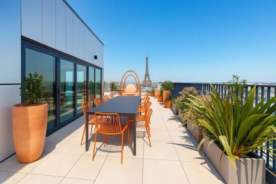 <p>Ce studio confortable, conçu pour une ou deux personnes, vous offrira toute l’indépendance et l’intimité dont vous avez besoin. Vous aurez un accès direct à votre <b>salle de bain</b> (WC et douche) mais aussi à un <b>bloc hôtel</b>.</p> <p>Comme les autres locataires, vous aurez accès à de grands espaces communs : une salle de fitness, un social lounge, une buanderie et un magnifique rooftop de 125 m² avec vue sur la Tour Eiffel.</p>
