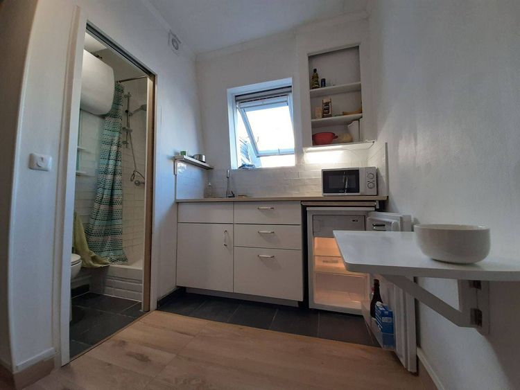 Petit studio de 10 m² (ex chambre de bonne) sous les toits, entièrement fonctionnel, situé dans un quartiers animé et central de Paris. Le studio est situé au 6ème étage d’un immeuble haussmannien (5 étages avec ascenseur + dernier étage avec escalier). Il dispose d’une fenêtre largement ensoleillée (avec rideau occultant électrique), d’une cuisine équipée (plaques de cuissons, four micro-onde, réfrigérateur, ustensiles de cuisine et vaisselle), d’une petite salle de douche avec wc (sanibroyeur), de nombreux rangements, d’un canapé-lit deux places (140cm), d’un bureau et d’un chauffage électrique amovible.