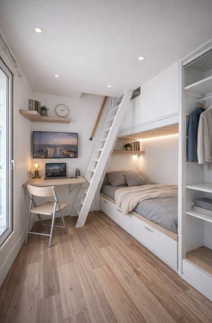 Niveau 0 : espace nuit avec lit, armoire, porte-manteau, télévision et bureau