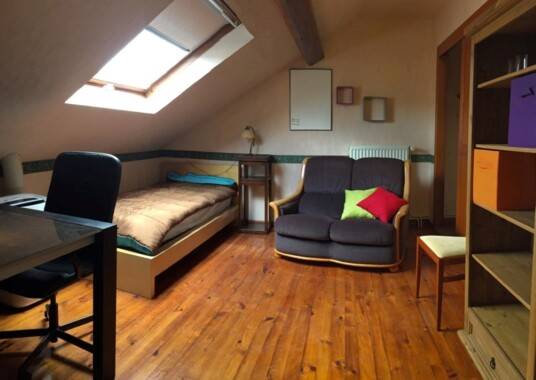 Occupée par un Ingénieur en exercice, souvent en déplacement. Elle est équipée d'un lit haut et d'un divan. Très lumineuse, soleil matin et midi. Grande armoire avec penderie et rayonnages, fauteuil, grand bureau, réfrigérateur, prises internet... Réfrigérateur Top. Sbb séparée, partagée avec ch 2, douche, lavabo, wc, radiateur sèche-serviettes.