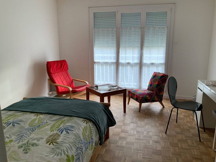 Grande chambre lumineuse meublée d’un lit double en 120 avec 3 tiroirs dans sa partie basse, d’un coin salon avec deux fauteuils et une table basse, d’un bureau et chaise, 2 étagères hautes en bois, d’une armoire étagères-penderie, d’une table de chevet, parquet au sol, grande porte fenêtre double vitrage avec store électrique ouvrant sur un balcon privatif.