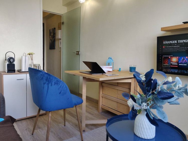 ✅ pièce principale (canapé convertible + table pliable + chaise) avec kitchenette équipée