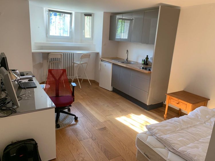 Pièce principale avec kitchenette, table bar, bureau et lit (1 place). Salle de douche avec wc.