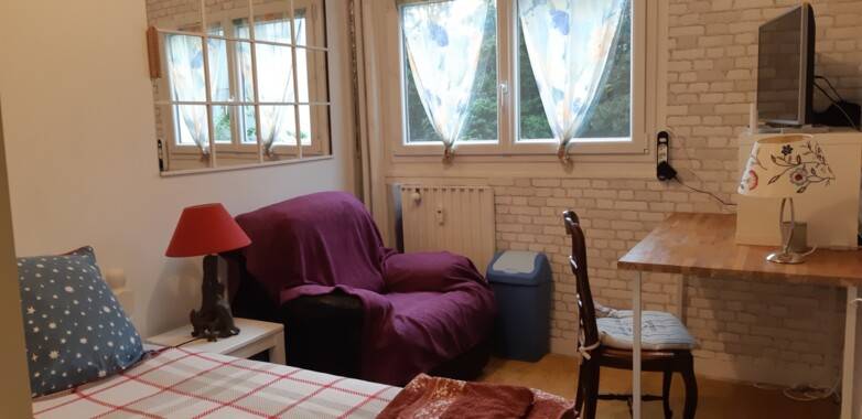 Vue sur espace vert avec un lit en 90 - une table de chevet - 2 lampes - un bureau - un fauteuil confortable - 2 perites petites armoires - TV avec wifi et plusieurs prises. Tapis.