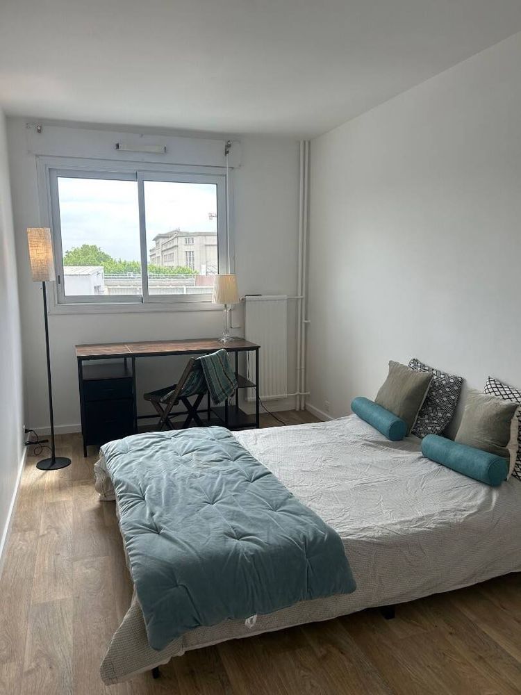 Claire, fonctionnelle et agréable, orientation Ouest, sur espace vert et cour intérieure vue dégagée. Grande baie vitrée, meublée avec un bureau, une armoire et un lit double en mezzanine.
