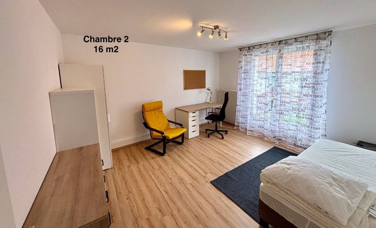 La chambre est équipée d’une armoire penderie, d’une grande commode, d’étagères, d'un grand bureau, avec un tableau liège, lampe de bureau, tapis de sol, fauteuil, et d'un lit 90x200 avec couette, oreiller, couverture.