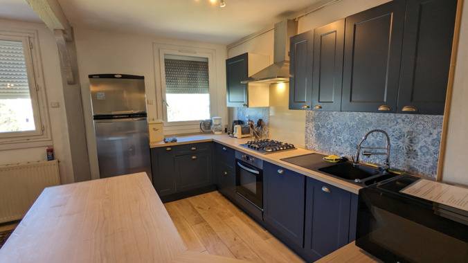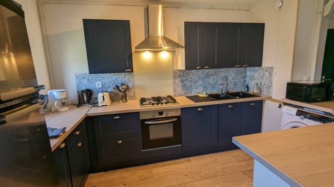 Cuisine équipée avec four, grand frigo/congélateur, plaques de cuisson au gaz, lave vaisselle et lave linge, ouverte au salon, 2 chambres avec lits 2 deux personnes, très grand placard de rangement, salle d'eau et WC séparé. Dans le salon, il y a un grand canapé lit.