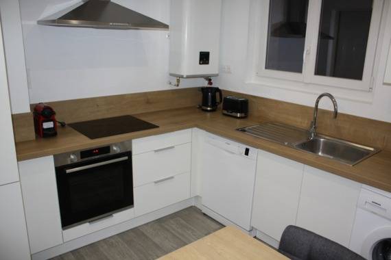 L'appartement comprend 3 chambres au total, une cuisine (toute équipée : frigo, four, lave-vaisselle, four micro-onde, vaisselle, casseroles, table + 4 chaises, lave-linge,...), et un salon de 16m² équipé d’un canapé, un fauteuil, une table, 4 chaises, une TV.