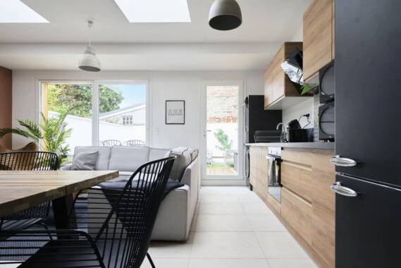 - Cuisine équipée ouverte (four, plaques de cuisson, petits et gros électroménagers, vaisselles, …)