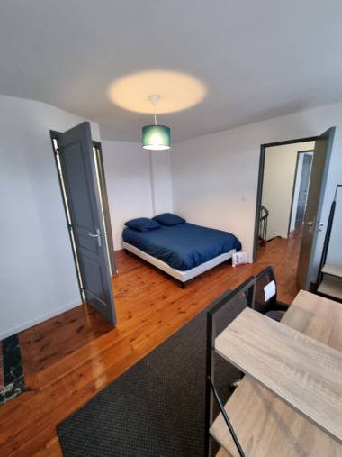 chambre située au 1er étage salle de bain avec douche, lavabo et WC. Lit 140/200, 2 grandes fenêtres avec double vitrage et stores occultant