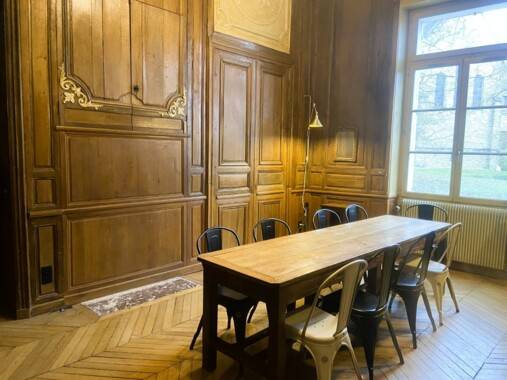 Chambre meublée entièrement rénovée (lit, table de chevet, bureau, chaise de bureau, meuble de rangement) avec salle d'eau + WC privatifs. Vue sur le parc de l'Abbaye de Vauhallan. Espaces en commun : Salon, salle à manger, cuisine, cellier, buanderies (lave-linge et sèche linge), jardin, terrasse avec vue sur les vignes. Abris vélos