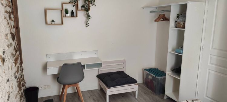 Chambre élégante, mur en pierre meulière. Cette chambre est dotée de deux fenêtres laissant entrer la lumière et orienter Sud. Cette chambre est équipée d'un lit deux places 190X200, un dressing et un bureau plus des équipements (guéridon ,table de nuit, fauteuil, chaise, lampe de chevet etc..)