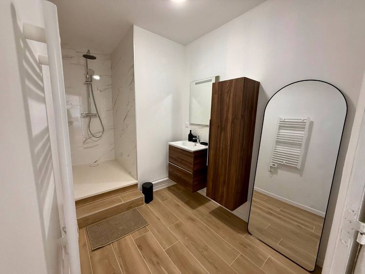 2 salles de bain modernes avec grandes douches et sèche-serviettes électriques