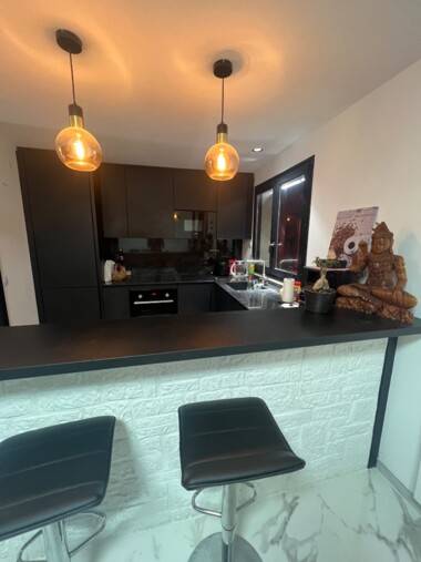 Cuisine tout équipée avec bar (four, plaques, frigo, lave-vaisselle, micro-ondes…)