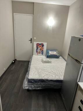 Chambre privative dotée d'un lit double avec matelas, d'un bureau, d'une chaise, d'une armoire et d'un réfrigérateur individuel.