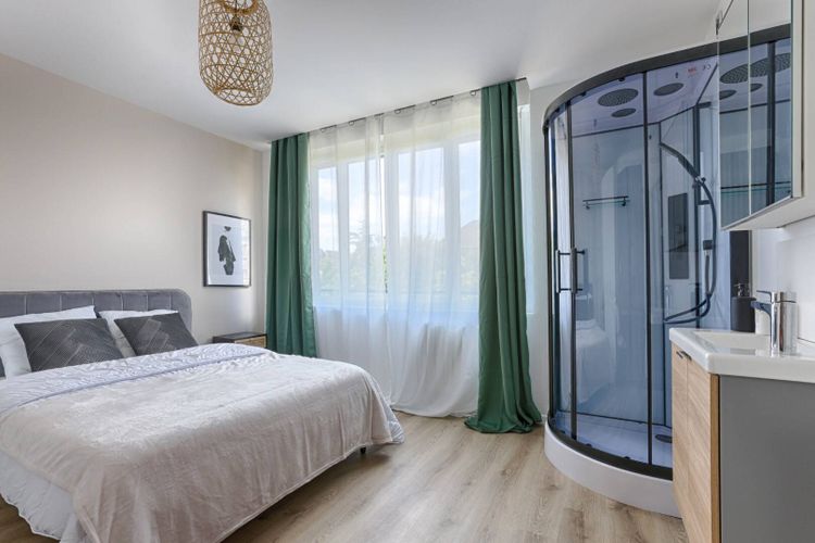 - une salle d'eau privative (douche 90x90cm), - une porte de chambre avec verrou, - un lit confortable 140x200cm - une table de chevet, - un grand dressing (penderie et étagères), - un grand bureau (avec lampe et prise réseau RJ45 + Wifi);