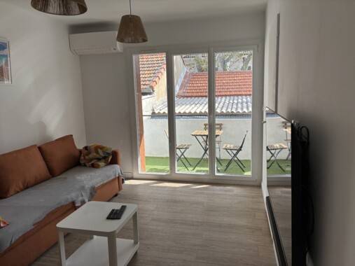 Chambre avec porte fenêtre donnant au sud sur la balcon et la cour intérieure (2ème étage) Equipements: Lit double en 140x190 Bureau + lampe de bureau Télé connectée 32' avec décodeur Commode Climatisation + ventilateur plafond