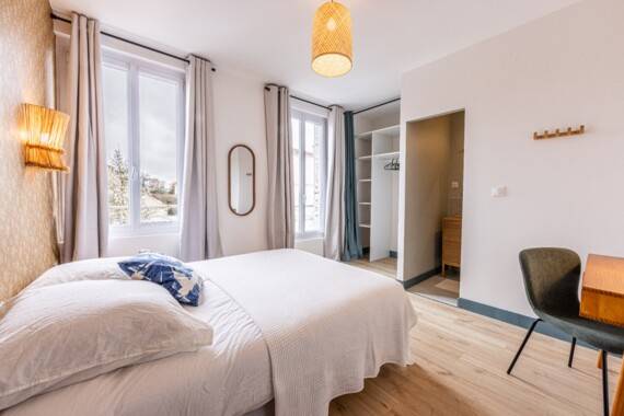 Chambre meublée et équipée avec salle de bain privative.