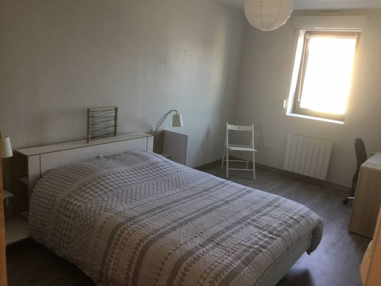 Chambre Lumineuse équipé qu'un lit 2 places (140x190) avec chevets, d'une grande armoire/penderie, d'un bureau avec lampe, d'une étagère, chaise de bureau, chaise pliante. Chauffage par radiateur à fluide individuel et programmable. Store électrique.