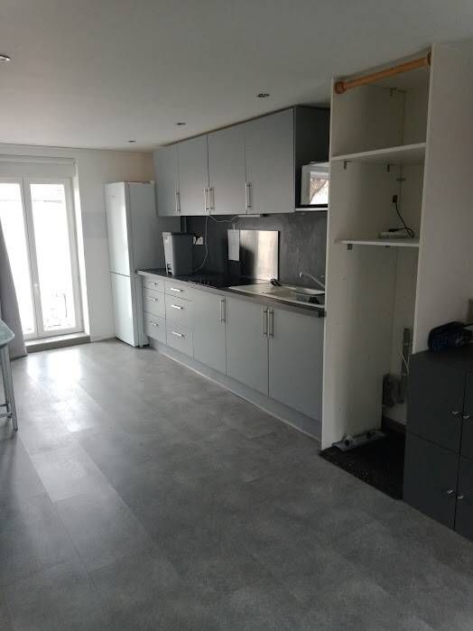 au 1er, la pièce à vivre contenant la kitchenette et les wc, et en duplex, la salle de bain commune aux deux chambres et la chambre privative pour 1 personne (côté rue)