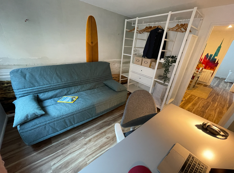Cozy room with: - Premium Convertible bed - Electric table - Premium chair - Big closest - Mirror - Videoprojector with netflix included - Power Strip - Full lightening