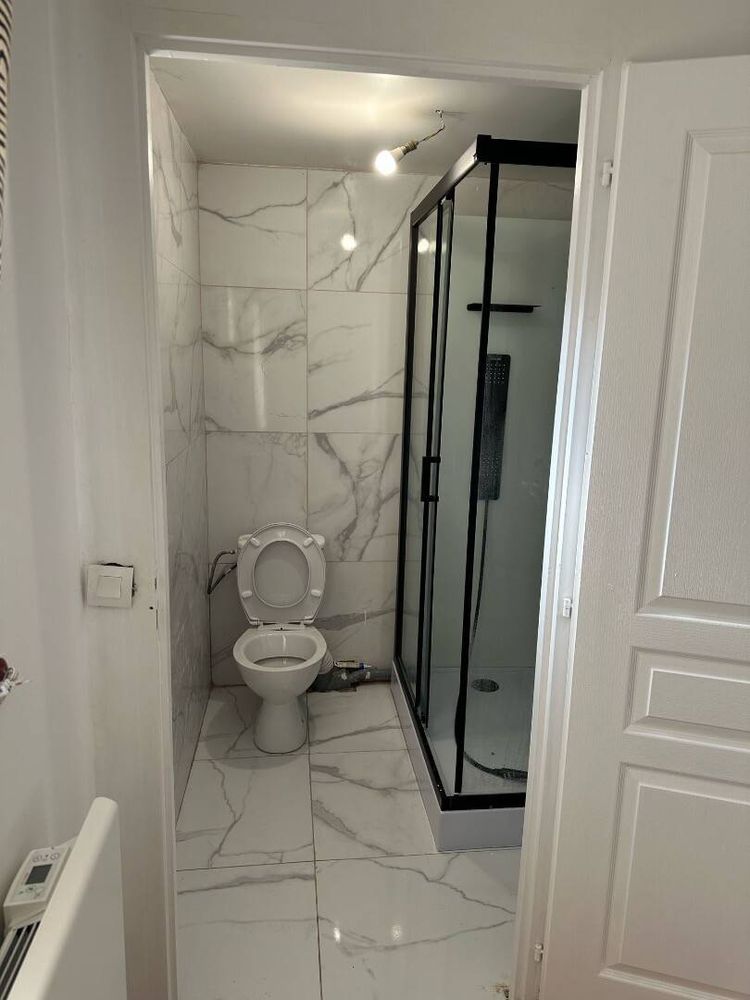 Chambre meublée de couleur blanche, avec salle de bain et toilettes intégré accompagné de commode et armoire .