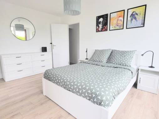 Chambre de 10m2 avec un lit double, une commode double, une table de chevet, une lampe de chevet et accès à la loggia de 10 m2 par les portes fenêtres.
