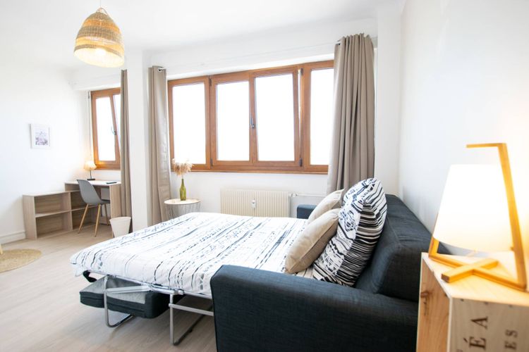 Grande chambre lumineuse, avec un canapé lit confortable de 140 x 190 cm déplié. Porte fermant à clef depuis l'interieur et l'exterieur. Télévision, grande armoire, bureau et sa chaise, table de chevet et sa lampe, literie et linge de maison. Volets électriques. Décoration sobre n'attendant que votre personnalisation.