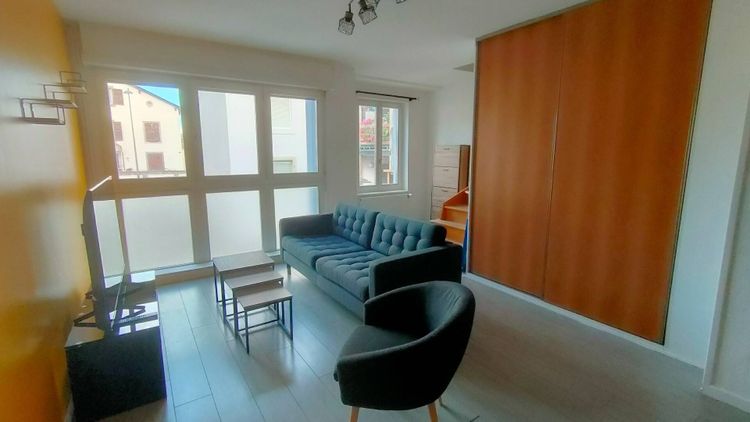 Chambre à l'étage du duplex, meublée avec un lit, un bureau, une armoire, une table de chevet et une étagère