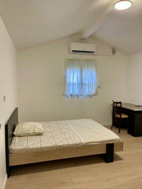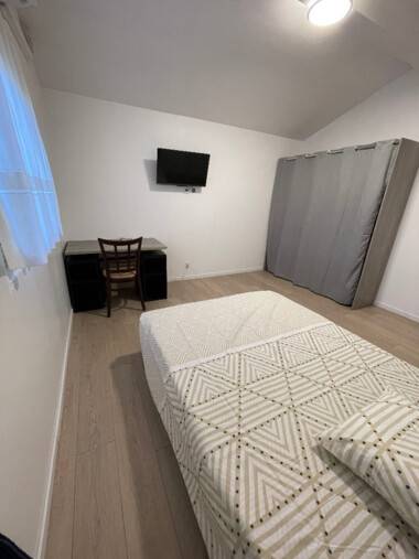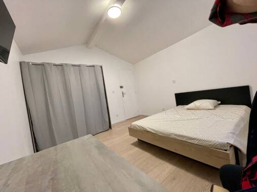 Chambre meublée 16 m² : lit/matelas 140 cm, armoire, bureau, chaise, TV, internet, étendoir, linge de lit.