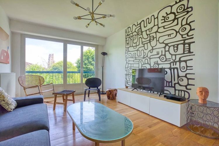 English below Français: Cette chambre comprend un lit double avec un matelas Merynos haut de gamme (500€ l'unité), un grand dressing, un bureau, une TV connectée, et un balcon donnant vue sur la cathédrale Sainte-Cécile. Les commodités supplémentaires incluent des prises de courant près du lit, des volets électriques et des fenêtres à double vitrage pour un confort optimal. English: This room includes a double bed with a premium Merynos mattress (500€ each), a large wardrobe, a desk, a connected TV, and a balcony with a view of the Sainte-Cécile Cathedral. Additional amenities feature bedside power outlets, electric shutters, and double-glazed windows for maximum comfort.