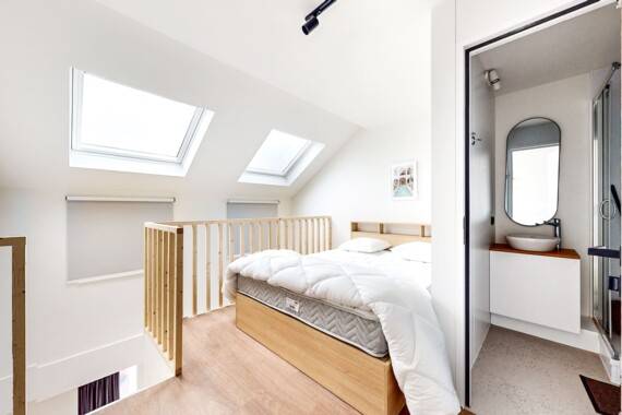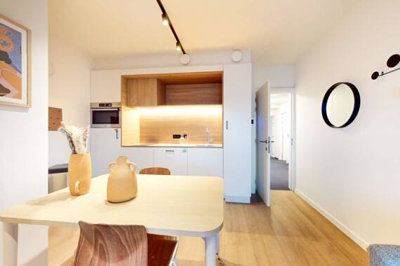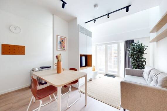 "Registration" possible. Welcome to La Résidence, a comfortable and modern living space perfect for two. This 37m² apartment is designed to make you feel at home, featuring a fully equipped kitchen with an oven, microwave, induction stove, fridge, and dishwasher. The living area is cozy with a sofa, coffee table, dining table, and TV for your relaxation. Upstairs in the duplex layout, you'll find a sleeping area with a queen-size bed (160x200) and a nightstand. The private bathroom includes a shower, sink, and toilet. Plus, enjoy your own balcony for some fresh air. The neighborhood is friendly and convenient with everything you need just a short walk away. Public transport is easily accessible: Sainte-Catherine metro station (Lines 1, 5) is only 3 minutes on foot, Yser metro station (Lines 2, 6) is 4 minutes away, Quai du Commerce bus stop (Lines 47, 57) is a 3-minute walk, and the Marguerite Duras tram stop (Tram 51) is just 2 minutes by foot. If you need to travel further, Brussels-North Station is a 20-minute walk from the apartment. The rent includes all the necessary charges such as water, electricity, heating, and high-speed internet. You won't have to worry about additional bills for these essentials. This apartment at La Résidence offers both comfort and convenience in a friendly neighborhood. It's perfect for those looking for a private space that feels like home right in the heart of the city.